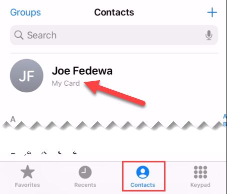 پس از ورود به این گزینه، وارد بخش Contacts یا مخاطبین شوید و در بالای لیست، به دنبال گزینه‌ی My Card باشید که در عکس زیر نشان داده شده است. دقت کنید که نامی که برای آن در نظر گرفته شده است مهم نیست و در حقیقت، شما باید به نوشته‌ی کم‌رنگ زیر اسم اصلی مخاطب خود نگاه کنید.
