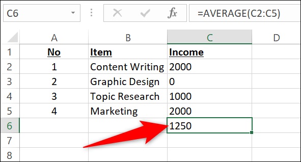 پس از این که فرمول را تایپ کردید کلید Enter را فشار دهید. پس از این که مراحل گفته شده را با موفقیت طی نمودید می توانید نتیجه میانگین محاسبه شده اعداد مورد نظرتان را در سلول انتخابی مشاهده نمایید.