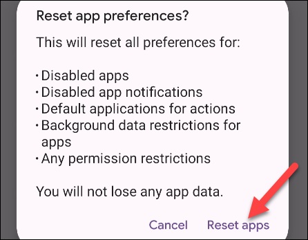 در این مرحله یک کادر محاوره ای برای تایید ظاهر می شود که اطلاعاتی از اتفاقاتی که پس از تایید آن خواهد افتاد به شما ارائه می دهد. برای ادامه بر روی گزینه «Reset Apps» ضربه بزنید.