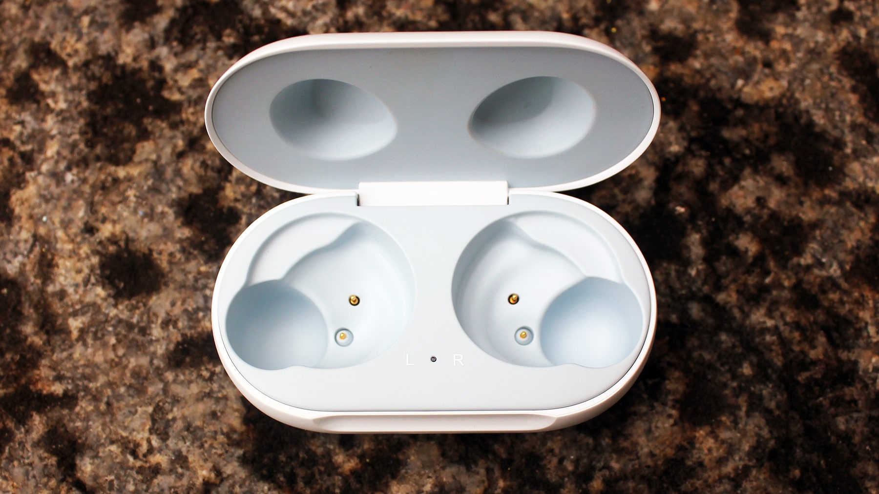 کیس شارژر دستگاه شباهت بسیاری به هدفون Gear IconX این شرکت دارد که در سال 2019 عرضه شده بود. به دلیل بیضی بودن بدنه به خوبی می توان آن را در جیب گذاشت بدون اینکه مشکلی ایجاد کند. کیفیت پلاستیک بدنه نیز بسیار خوب است و لولای آن نیز کیفیت بالایی دارد.