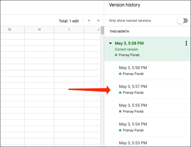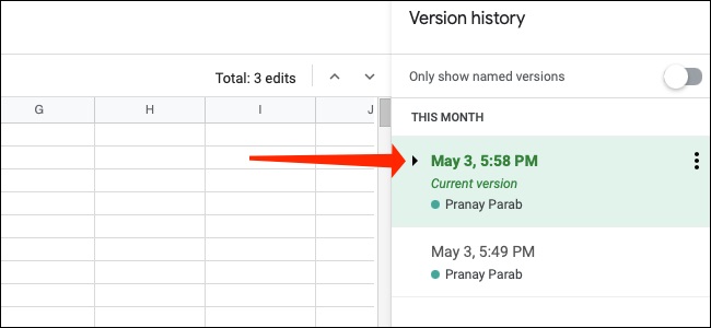 این گزینه یک گزارش کامل از تمام تغییرات ایجاد شده در صفحه گسترده شما را برای شما نمایش می دهد. شما می توانید این گزارش را در یک پنجره در سمت راست صفحه مشاهده کنید. گوگل این تغییرات را بر اساس تاریخ و زمان گروه بندی میکند. برای رفتن به نسخه ی مورد نظر خود می توانید روی هر یک از رکورد های زمانی کلیک کنید.