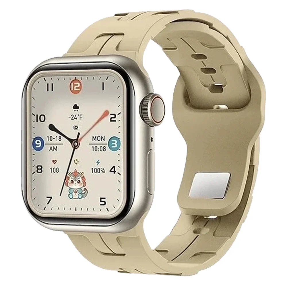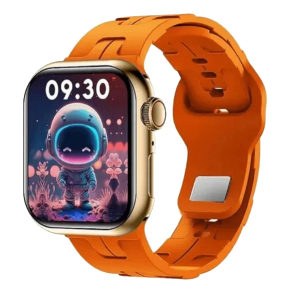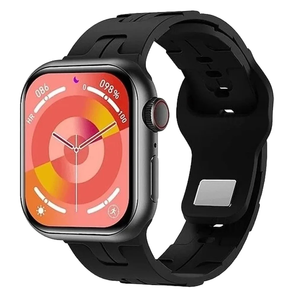 ساعت دارای قاب مستطیلی شکل با ابعاد 41.3 در 34.9 میلیمتر و ضخامت 12 میلیمتر است که با وزن سبک 29.5 گرم، حس راحتی در استفاده روزمره، رسمی و ورزشی فراهم میکند. جنس بدنه از آلیاژ روی و بند آن از نوع سیلیکونی بافتدار و تریل لوپ است که هم مقاوم است و هم ظاهر زیبایی دارد. طراحی دکمه پاور و مجیک باتن نیز بسیار شبیه به اپل واچ است، بدون صدا و با عملکرد فعال، که حس لوکستری به دستگاه میبخشد.