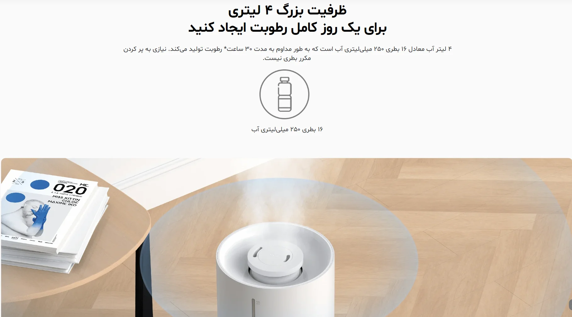 مخزن 4 لیتری این بخور سرد، امکان تا 30 ساعت رطوبتدهی پیوسته را فراهم میکند. به بیان ساده، این حجم معادل 16 بطری 250 میلیلیتری آب است؛ یعنی بدون نیاز به پر کردن مکرر، میتوانید یک شبانهروز کامل از هوای مرطوب و دلپذیر لذت ببرید.