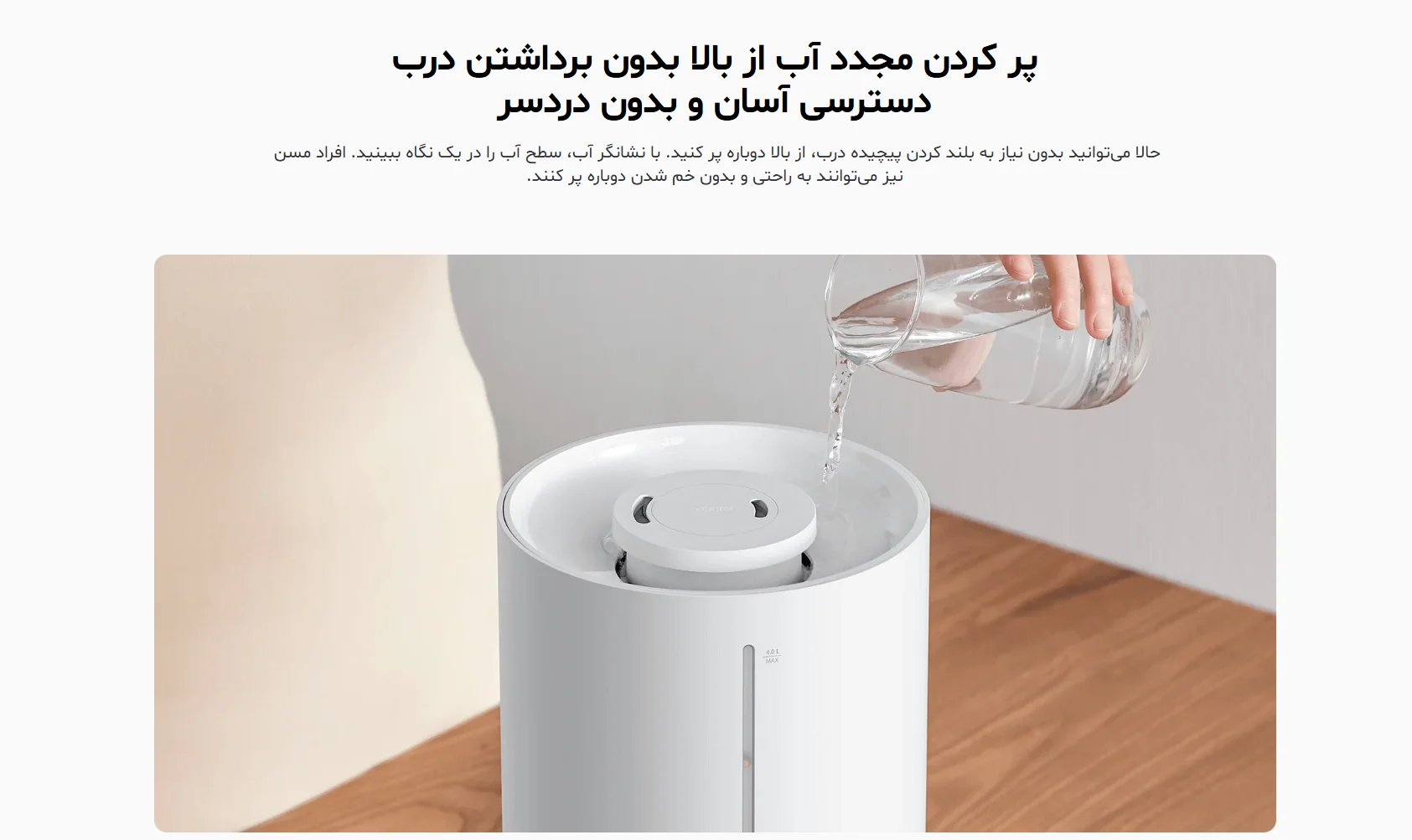 طراحی Top-Fill یا پر کردن آب از بالا، استفاده از دستگاه را بسیار راحت کرده است. بدون نیاز به جدا کردن مخزن یا بلند کردن درب، میتوان مستقیماً آب را اضافه کرد. وجود نشانگر شفاف سطح آب نیز باعث میشود در یک نگاه از میزان آب باقیمانده مطلع شوید.