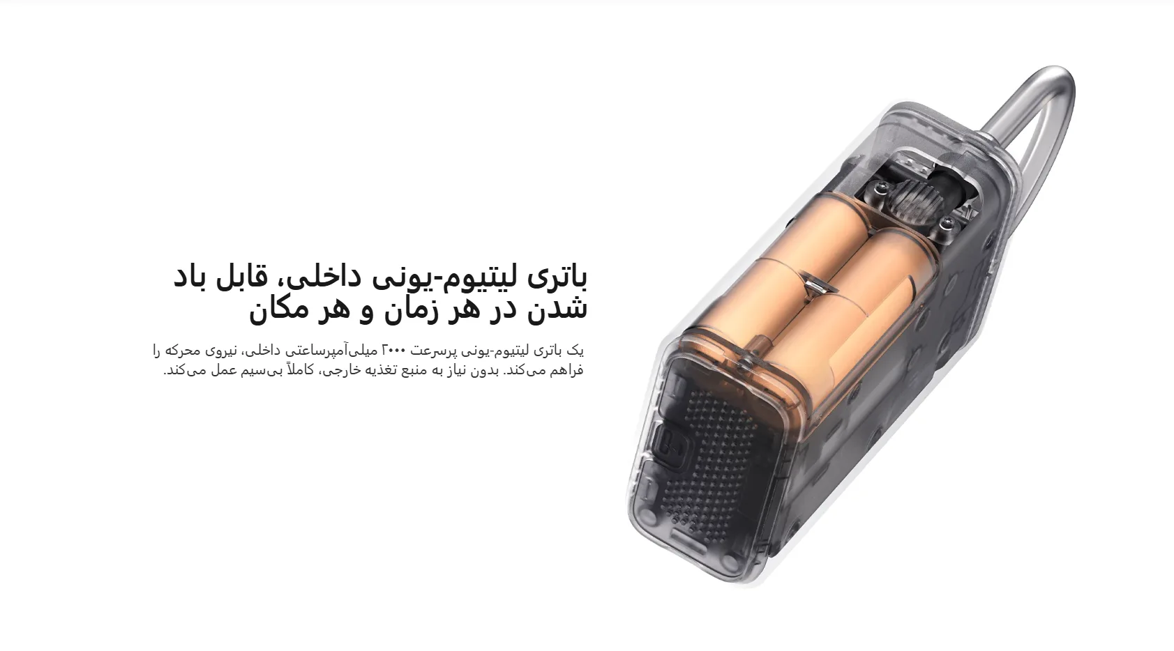 باتری لیتیومیونی 2000 میلیآمپرساعتی امکان استفاده کاملاً بیسیم را فراهم میکند. با یک بار شارژ کامل: