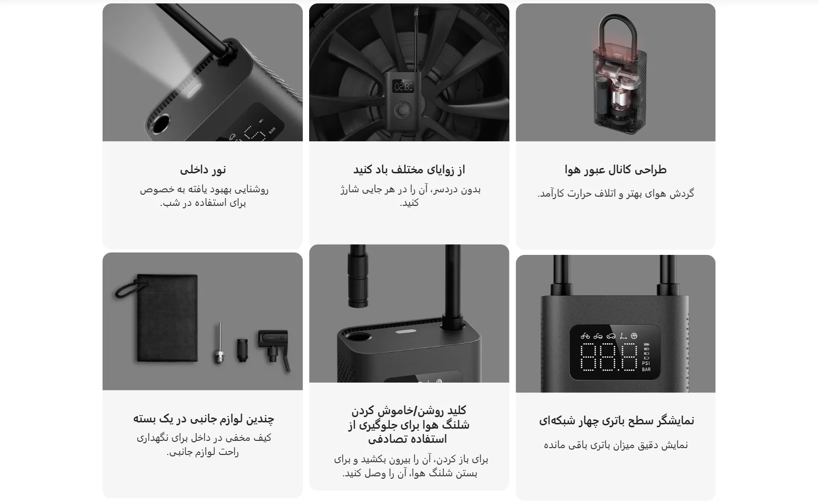 این پمپ باد با وزن تقریبی 490 گرم و ابعاد جمعوجور، کاملاً مناسب حمل روزمره است. طراحی مینیمال، بدنه مقاوم و کیف مخفی داخلی برای نگهداری متعلقات، حس یک محصول باکیفیت و حرفهای را منتقل میکند. وجود شلنگ با کلید قطع و وصل نیز از فعال شدن ناخواسته دستگاه جلوگیری میکند.