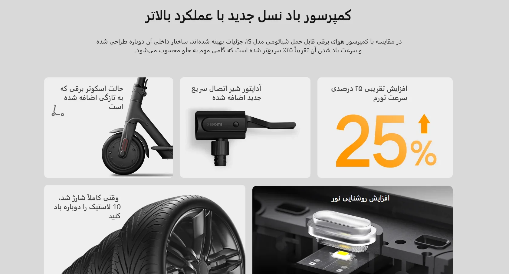 Xiaomi Portable Electric Air Compressor 2 یک پمپ باد قابل حمل، دقیق و قدرتمند است که برای استفاده روزمره و سفر طراحی شده. سرعت بالاتر، دقت بیشتر، حالتهای هوشمند و طراحی سبک، آن را به انتخابی مطمئن برای رانندگان، دوچرخهسواران و کاربران اسکوتر برقی تبدیل میکند.