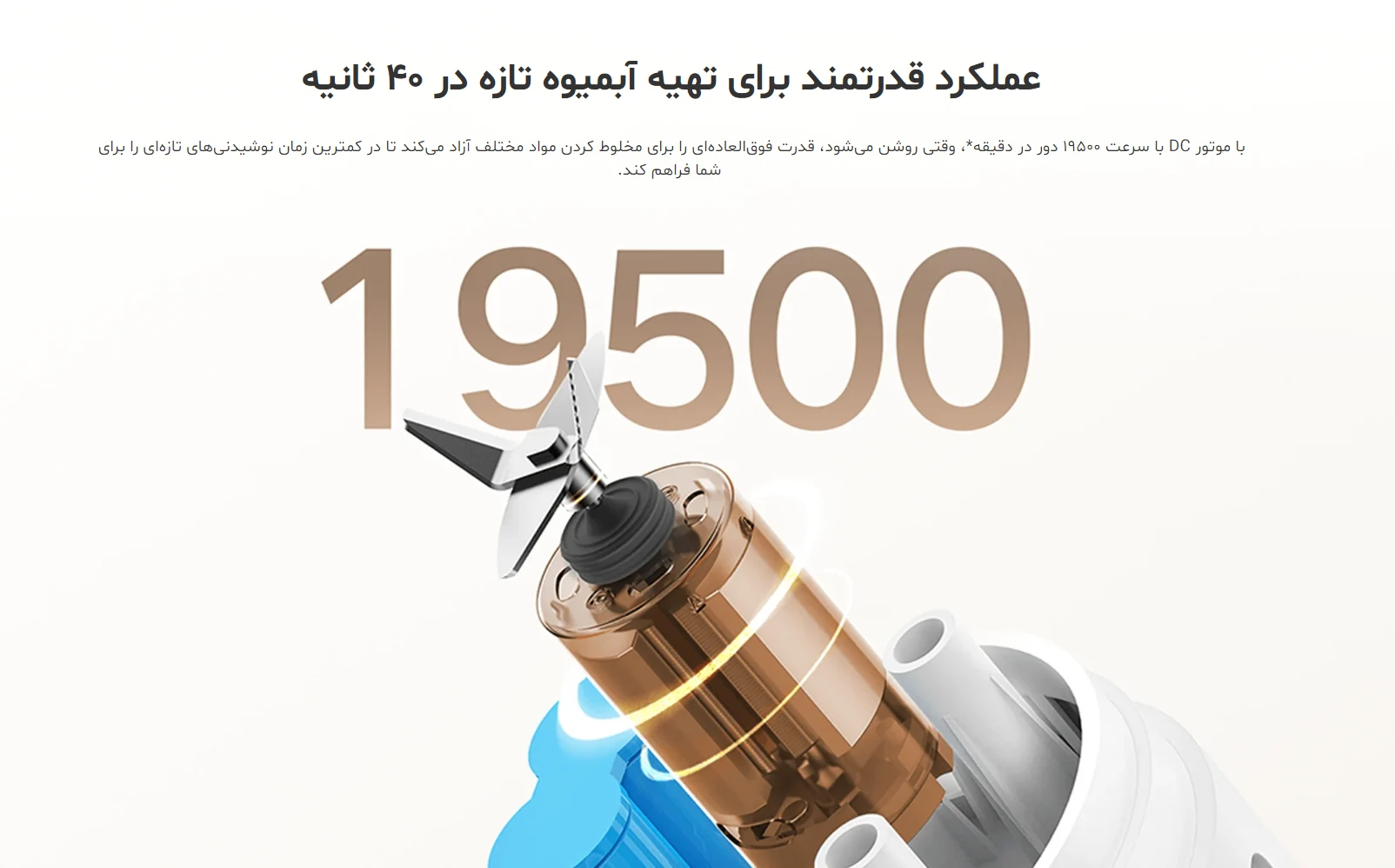 قلب تپنده این دستگاه یک موتور ۱۹,۵۰۰ دور بر دقیقه است که با روشن شدن، قدرت انفجاری خود را برای خرد و میکس کردن میوهها آزاد میکند. نتیجهاش این است که تنها در ۴۰ ثانیه میتوانید یک نوشیدنی تازه و یکدست آماده داشته باشید.