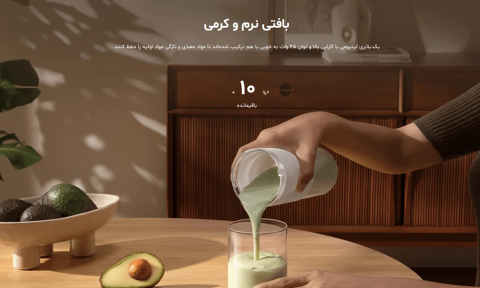 باتری قدرتمند و توان ۴۵ واتی دستگاه باعث میشود میوهها کاملاً له شده و بافت نوشیدنی نرم و “کریمی” باشد.