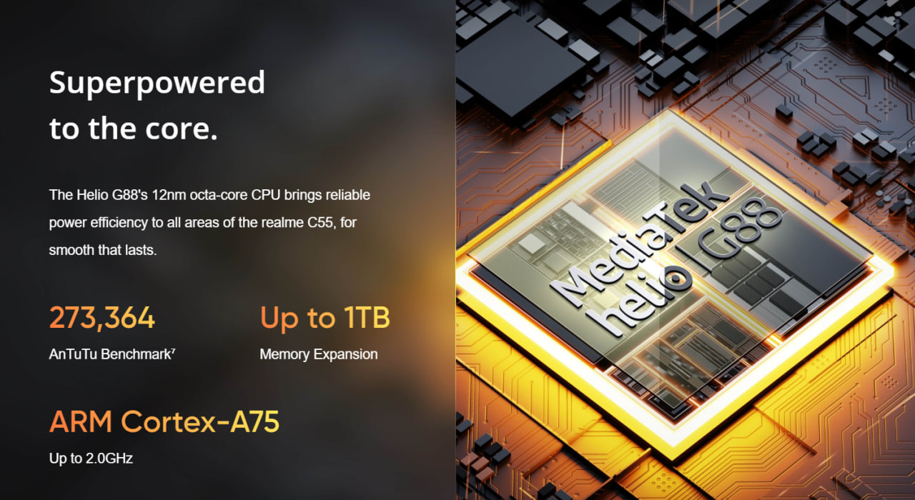 عملکرد و نتایج بنچمارک ریلمی C55 از تراشه هلیو G88 ساخت مدیاتک بهره میبرد که نسخهای کمی ارتقایافته از سیستم روی تراشه (SoC) هلیو G85 است. نسخه G88 به طور رسمی از نمایشگر 90 هرتز با وضوح 1080p+ پشتیبانی میکند و میتواند با دوربینهای اصلی 64 مگاپیکسلی به جای 48 مگاپیکسلی کار کند. این قابلیت پیش از این بدون تغییرات و سفارشیسازیهای بیشتر توسط سازنده امکانپذیر نبود.