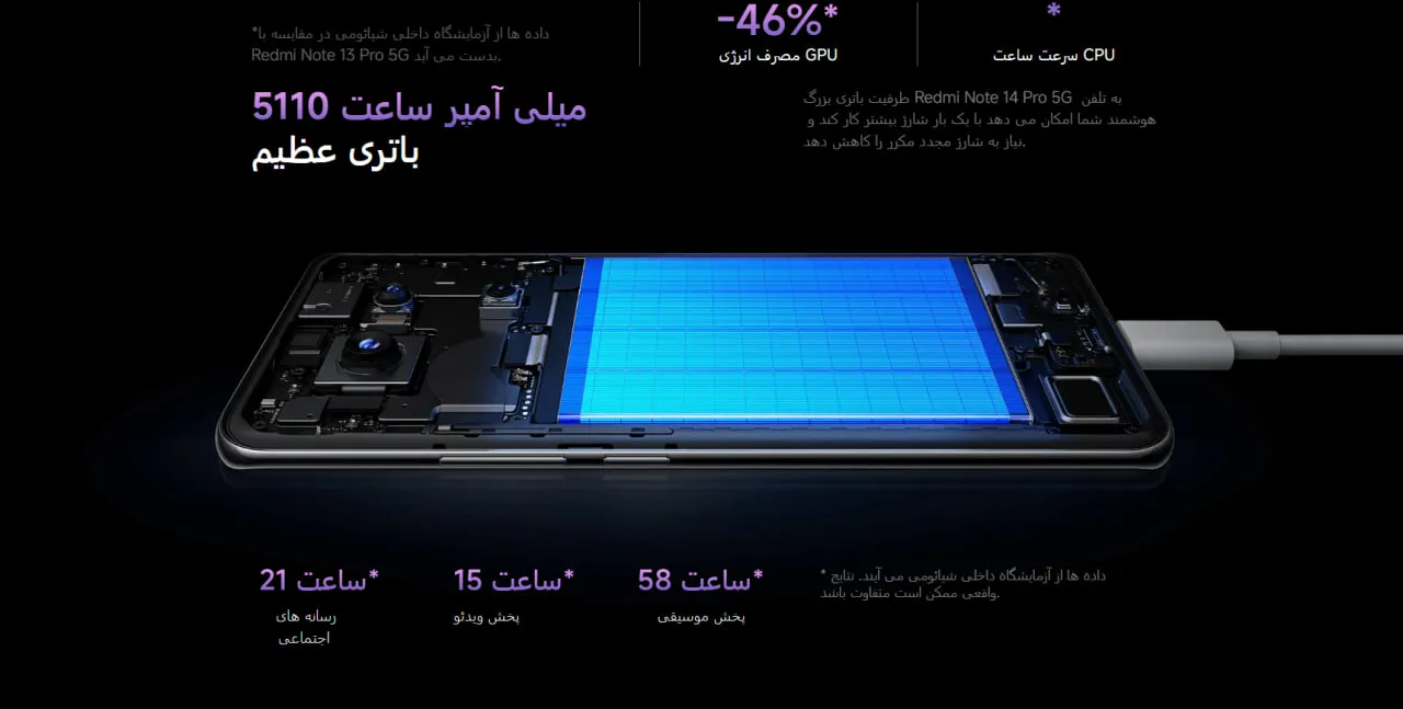 🔹 ظرفیت: 5110 میلیآمپر ساعت که برای یک روز استفاده سنگین کافی است و با استفاده سبک، تا دو روز دوام دارد.