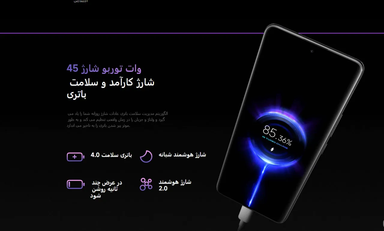🔹 سرعت شارژ: شارژ ۴۵ واتی نسبت به مدل قبلی (۶۷ وات) کاهش یافته، اما همچنان سرعت بالایی دارد. در ۱۵ دقیقه ۳۳٪ و در ۳۰ دقیقه ۶۴٪ شارژ میشود.