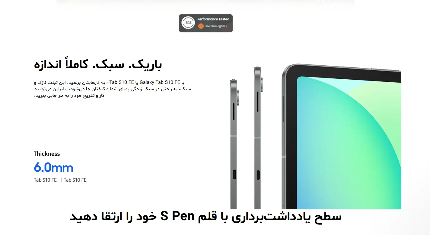 سامسونگ در طراحی تبلت S10 FE سنگ تمام گذاشته است. بدنهی فلزی، ضخامت 6 میلیمتری و حاشیههای باریک نمایشگر باعث شده این تبلت ظاهری مدرن و حرفهای داشته باشد.