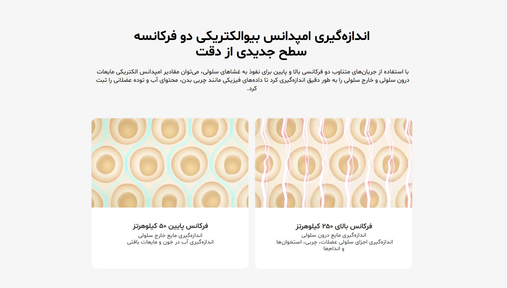 ترازوی هوشمند شیائومی مدل S400 از فناوری Bioelectrical Impedance Analysis (BIA) با دو فرکانس ۵۰kHz و ۲۵۰kHz استفاده میکند. این فناوری مشابه روشهای پزشکی DEXA، توانایی تحلیل دقیق مایعات درونسلولی و برونسلولی را دارد و میزان چربی بدن، عضله، آب و استخوان را با دقتی بسیار بالا میسنجد.