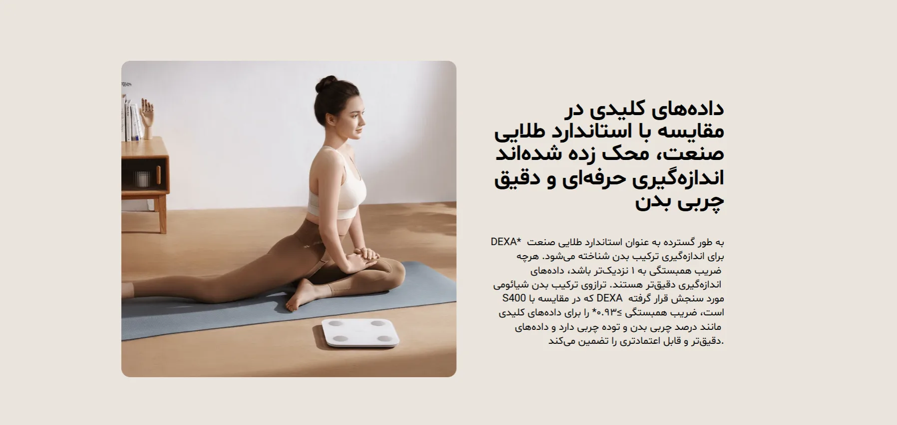 🔬 دقت اندازهگیری چربی بدن در ترازو S400 با استاندارد طلایی DEXA مقایسه شده و ضریب همبستگی آن بیش از 0.93 است — یعنی نزدیکترین نتیجه به دستگاههای آزمایشگاهی.