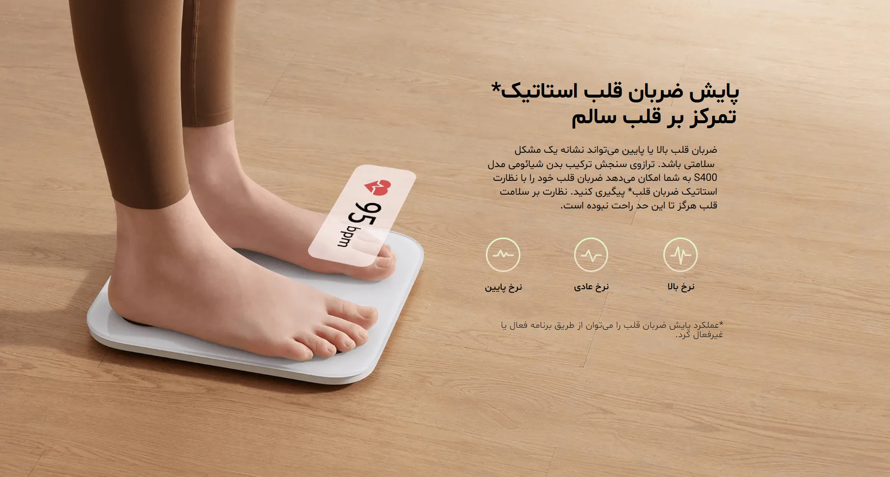 در هر بار وزنکشی، S400 ضربان قلب شما را نیز اندازه میگیرد و در صورت بالا یا پایین بودن از محدوده نرمال (۶۰ تا ۱۰۰ bpm) هشدار میدهد. این دادهها به کمک اپلیکیشن قابل تحلیل هستند و در کنار شاخصهای بدن، تصویری دقیق از وضعیت فیزیولوژیک شما ارائه میدهند.