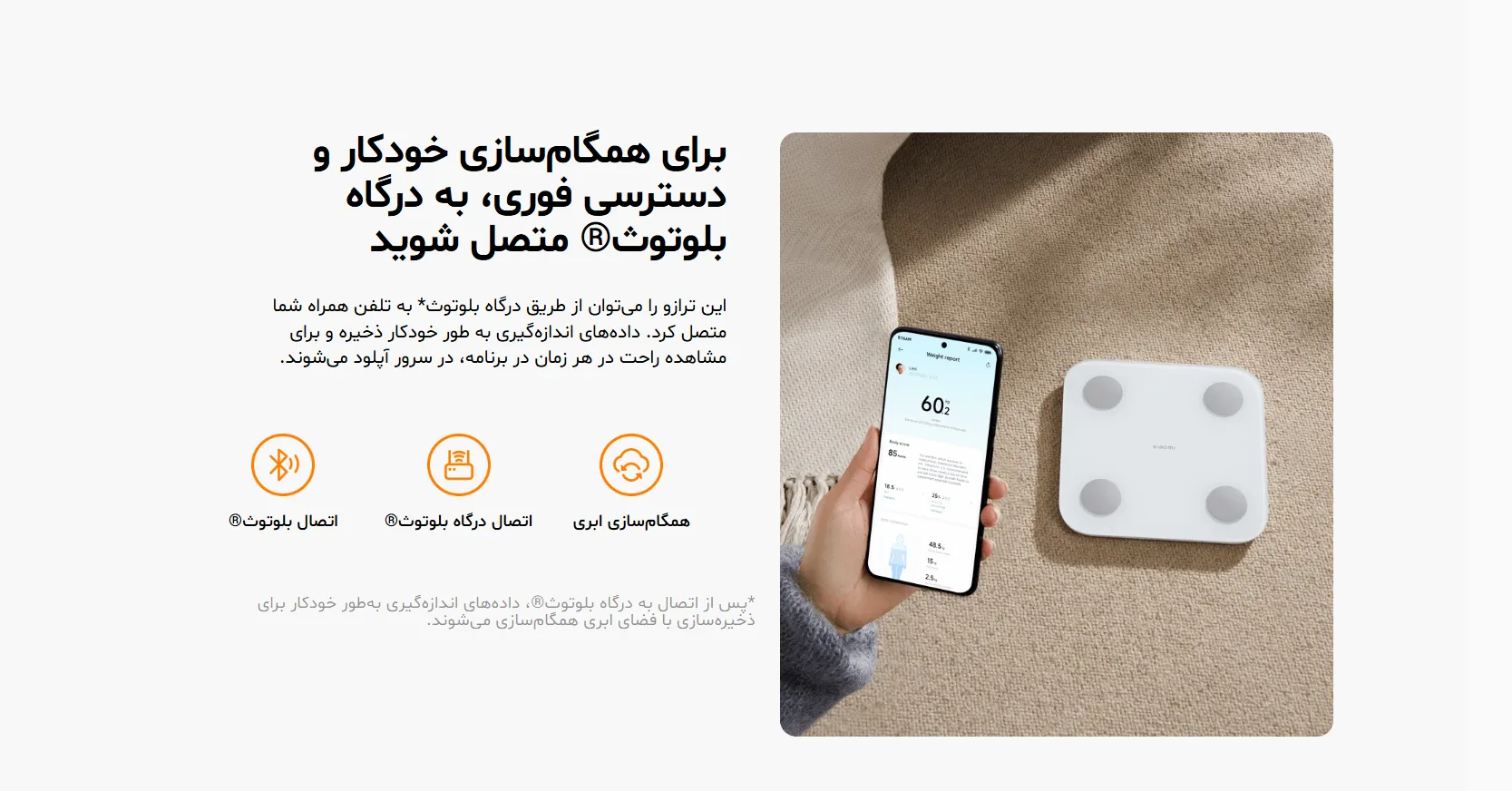 برای نصب ترازوی دیجیتال روی گوشی شیائومی، کافیست آن را از طریق بلوتوث BLE 5.0 به اپلیکیشن Xiaomi Home متصل کنید. پس از اتصال، تمام دادهها بهصورت خودکار ذخیره شده و با حساب کاربری ابری شیائومی همگام میشوند.