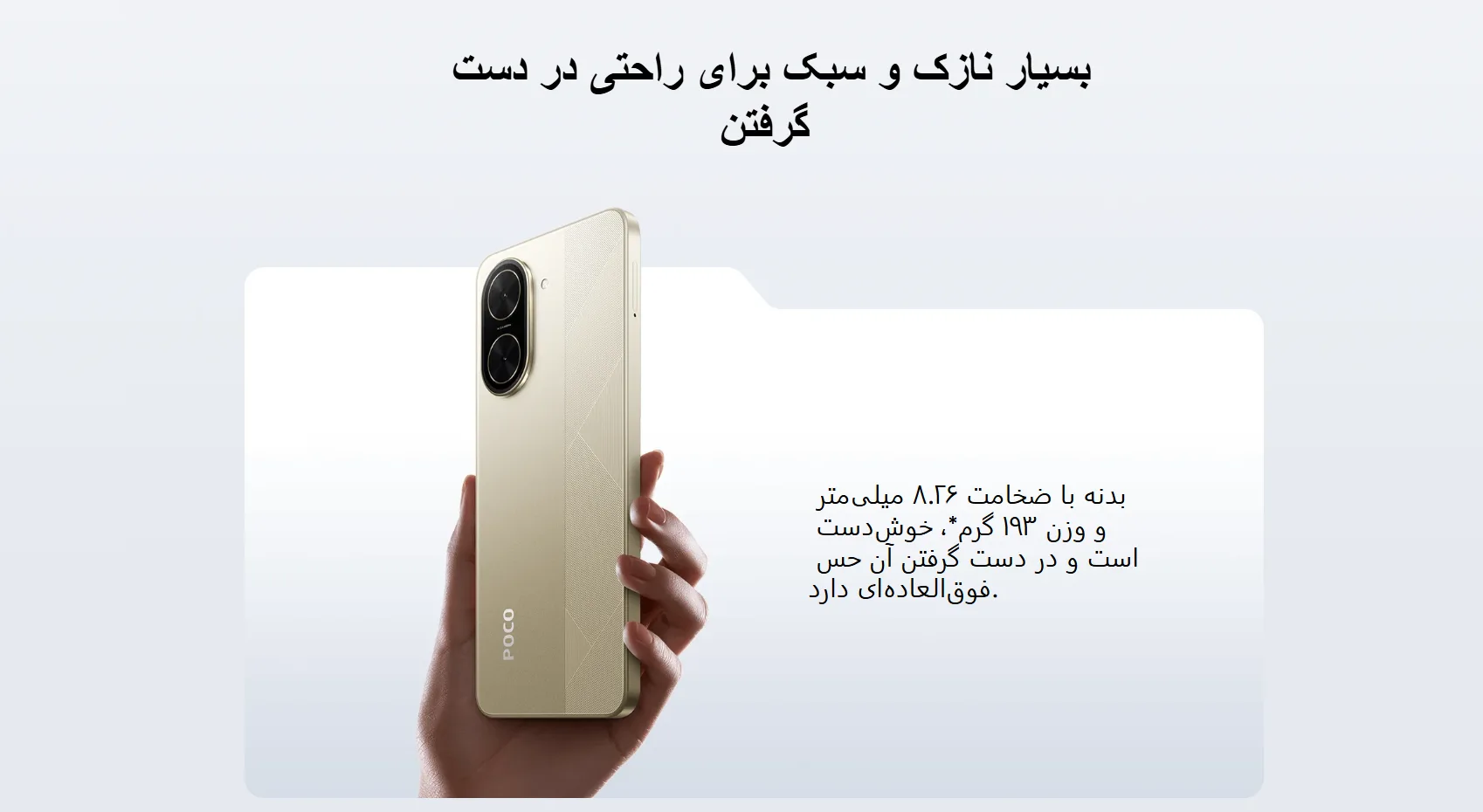 در نگاه اول، POCO C71 اصلاً شبیه به یک گوشی اقتصادی به نظر نمیرسد. طراحی براق و رنگبندیهای زیبا (Power Black، Desert Gold و Cool Blue) با بافت مات پشت دستگاه، ظاهری پریمیوم به گوشی میبخشند. وزن دستگاه 193 گرم است و ابعاد 171.8 در 77.8 در 8.3 میلیمتر، باعث میشود خوشدست باشد. این گوشی از حسگر اثر انگشت در کناره بهره میبرد که سریع و دقیق عمل میکند. همچنین از استاندارد IP52 برای مقاومت در برابر پاشش آب و گردوغبار برخوردار است.