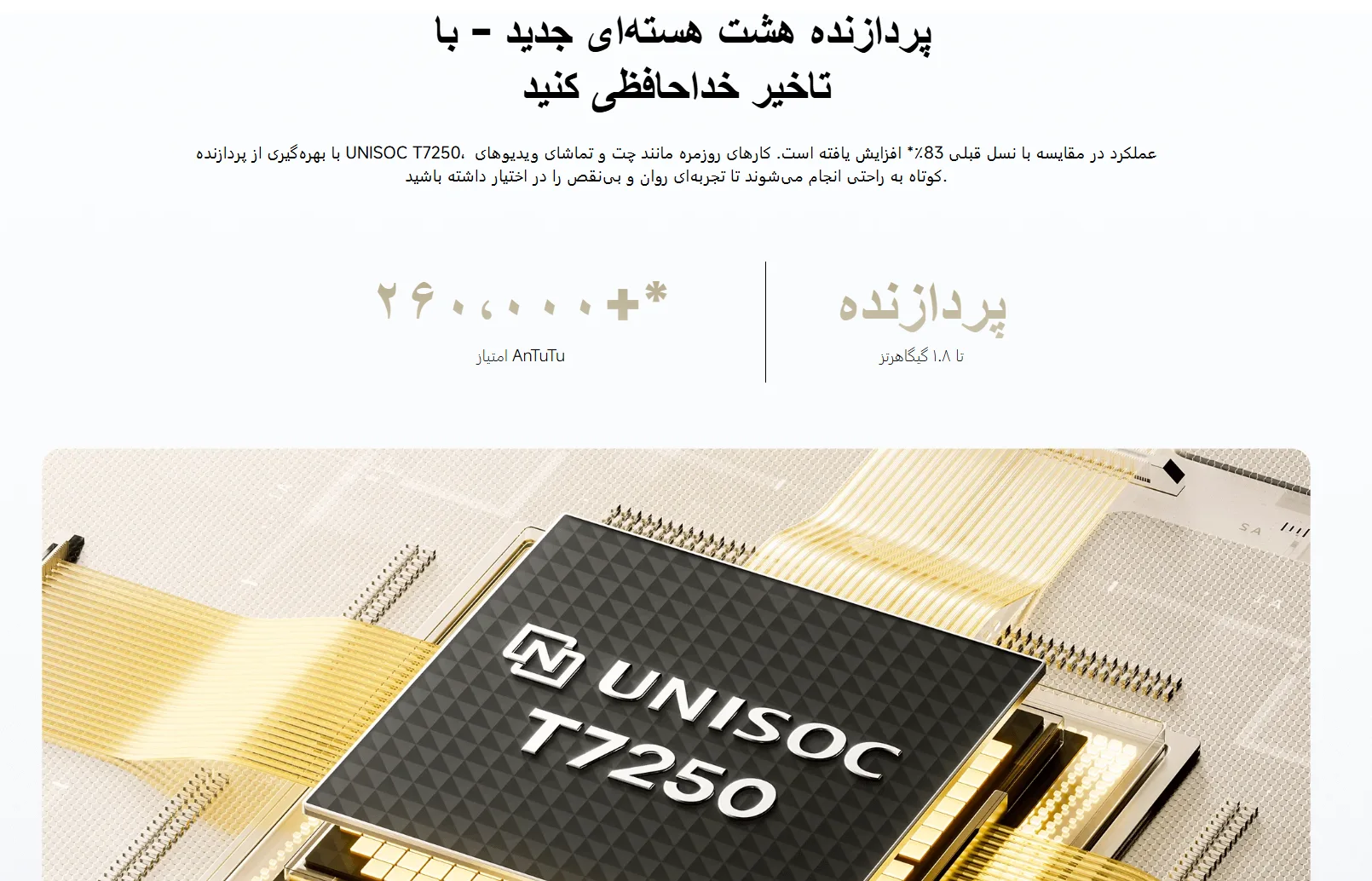 این گوشی به پردازنده Unisoc T7250 (12 نانومتری) مجهز است که برای کاربریهای روزمره مناسب است. اجرای برنامههایی مانند یوتیوب، شبکههای اجتماعی و بازیهای سبک (مثل Subway Surfers) روان است. اما در بازیهای سنگین مانند PUBG Mobile، عملکرد در سطح متوسط (30fps در تنظیمات متوسط) باقی میماند.
