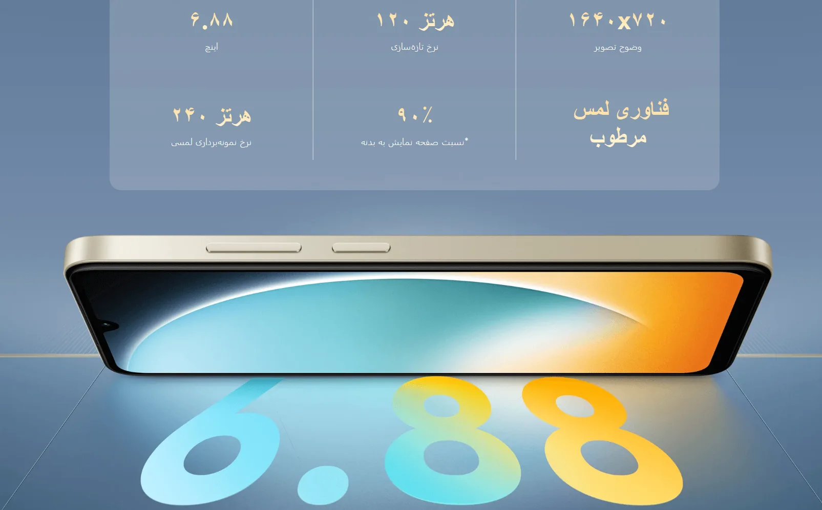 نمایشگر 6.88 اینچی IPS LCD با نرخ نوسازی 120 هرتز، یکی از ویژگیهای برجسته این گوشی است. رزولوشن 720×1600 پیکسل و تراکم 260ppi کیفیت متوسطی ارائه میدهد، اما نرخ نوسازی بالا باعث روان بودن اسکرول و انیمیشنها میشود. حداکثر روشنایی 600 نیت، دیدن صفحه در نور محیطی خوب را ممکن میکند، هرچند زیر نور مستقیم آفتاب ممکن است مشکلساز شود.