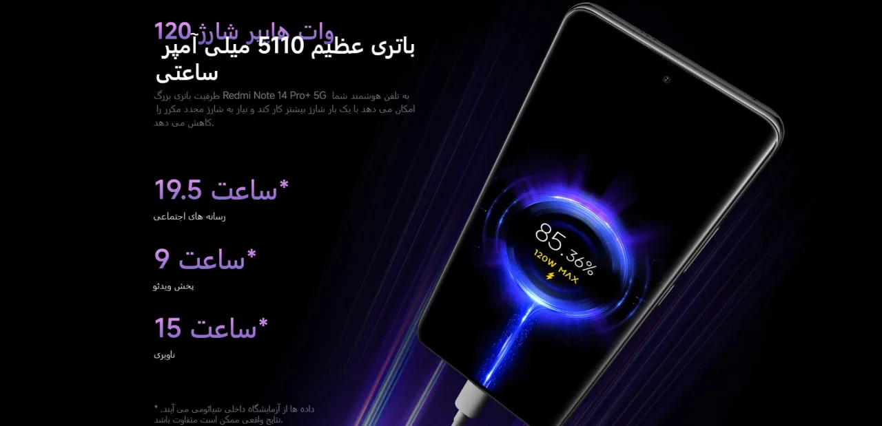 ردمی نوت 14 پرو پلاس به یک باتری 5110 میلیآمپرساعتی مجهز شده که نسبت به مدل قبلی تنها اندکی بزرگتر است. این باتری از فناوری جدیدی بهره میبرد که عملکرد بهتری در دماهای زیر صفر دارد.