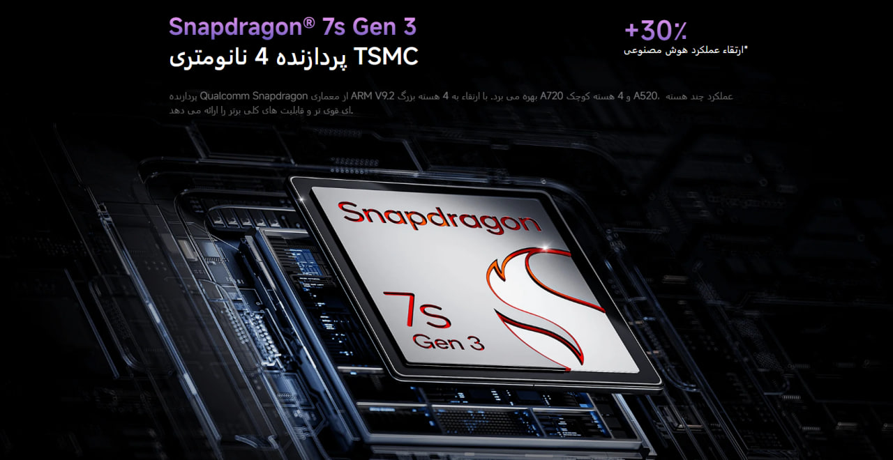 این گوشی از چیپست Snapdragon 7s Gen 3 بهره میبرد که نسبت به نسل قبل، پیشرفتهای قابل توجهی در پردازنده، پردازنده گرافیکی و عملکرد هوش مصنوعی دارد. این تراشه 4 نانومتری دارای پردازندهای هشت هستهای و پردازنده گرافیکی Adreno 710 است.
