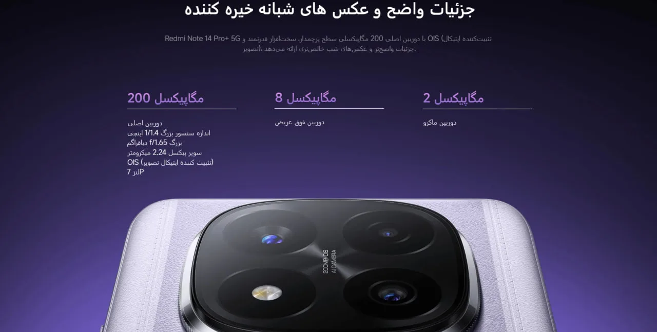 ردمی نوت 14 پرو پلاس از یک دوربین اصلی 200 مگاپیکسلی سامسونگ ISOCELL HP3 با گشودگی دیافراگم f/1.7، فوکوس خودکار چندجهته و لرزشگیر اپتیکال تصویر (OIS) بهره میبرد.