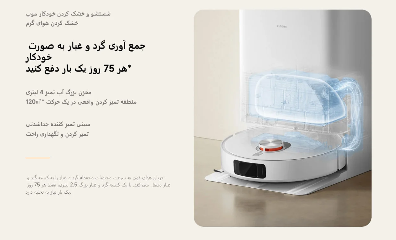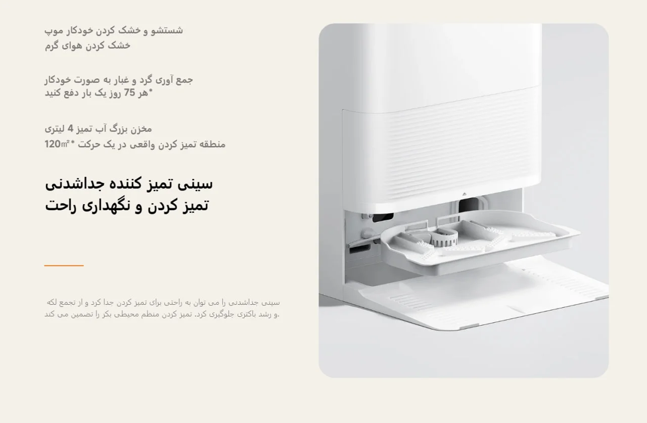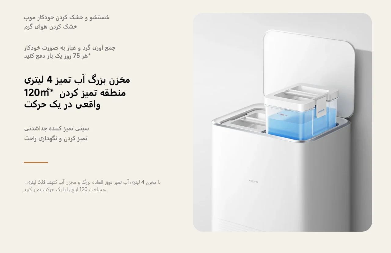 X20 Pro به یک داک چندمنظوره مجهز است که نهتنها مخزن گرد و غبار را بهطور خودکار تخلیه میکند، بلکه پدهای تیکشی را نیز با آب تمیز میشوید. این داک یک مخزن ۴ لیتری آب تمیز و یک مخزن ۳.۸ لیتری آب کثیف دارد. همچنین یک کیسه ۲.۵ لیتری برای گرد و غبار دارد که طبق ادعای شیائومی تا ۷۵ روز نیاز به تعویض ندارد.
