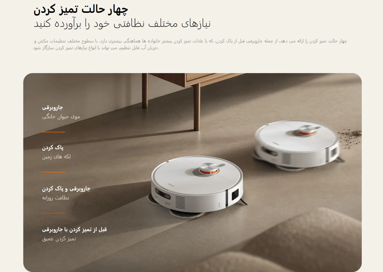 همچنین میتوانید بین حالتهای مختلف تمیزکاری مانند فقط جارو، فقط تیکشی، جارو قبل از تیکشی یا هر دو بهصورت همزمان انتخاب کنید. چهار حالت مکش (بیصدا، استاندارد، قوی و توربو) و سه سطح آب برای تیکشی هم در دسترس هستند.