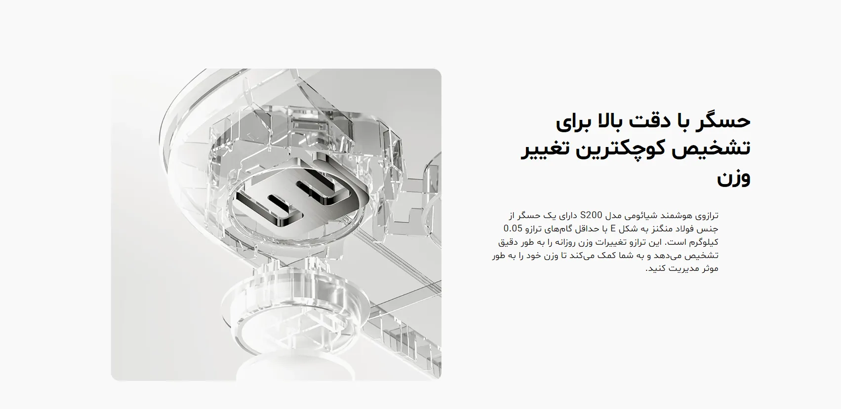 قلب ترازوی هوشمند شیائومی مدل S200 یک حسگر فولاد منگنز با دقت ۰.۰۵ کیلوگرم است که حتی کوچکترین تغییرات وزن بدن را تشخیص میدهد. محدوده وزنکشی از ۰.۱ تا ۱۵۰ کیلوگرم بوده و این یعنی هم برای وزن کردن انسانها، هم برای وزن کردن اشیای کوچک مانند وسایل آشپزخانه یا حتی نوزادان قابل استفاده است.