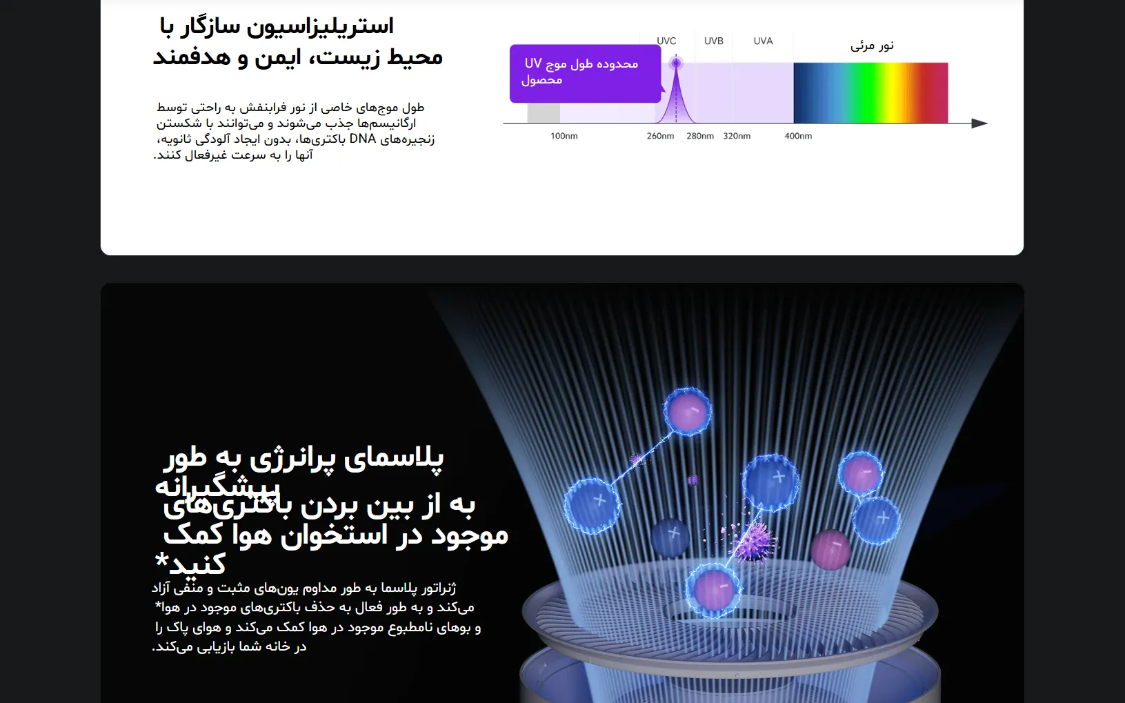 وجود LED UV-C داخلی از آلودگی ثانویه فیلتر جلوگیری میکند و فناوری پلاسما با آزادسازی یونهای مثبت و منفی، بهصورت مداوم به پاکسازی هوا کمک میکند.