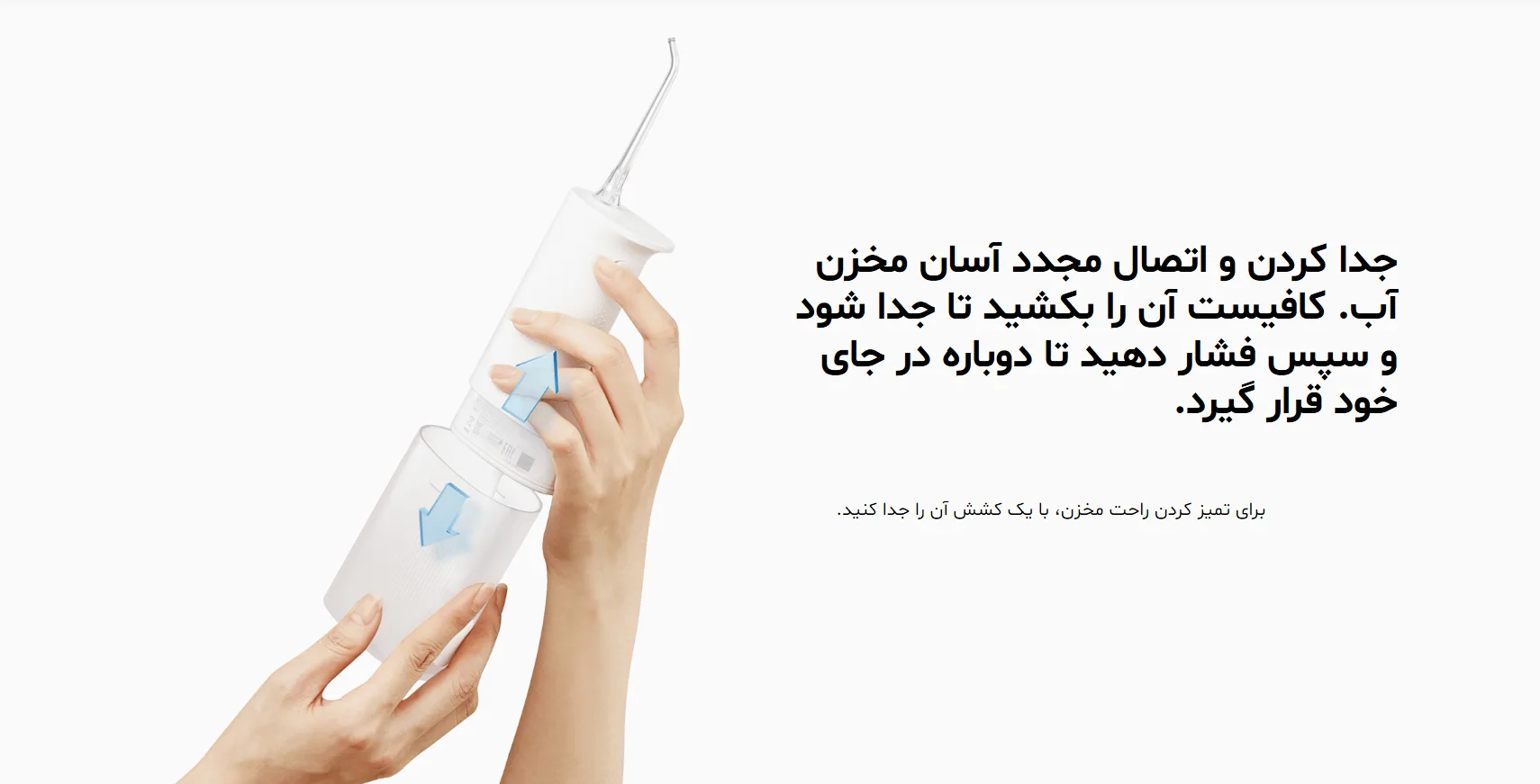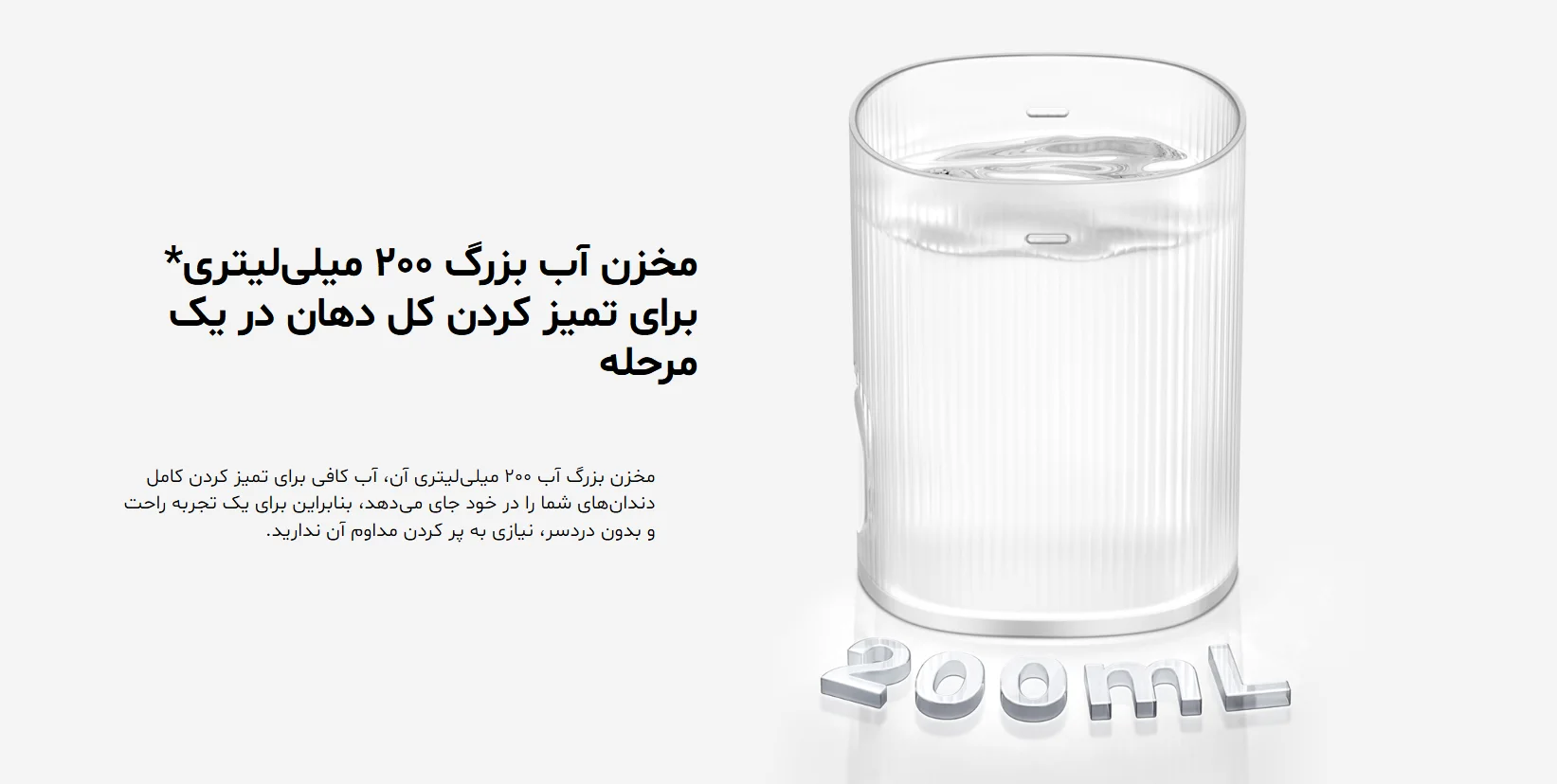 مخزن آب 200 میلیلیتری این واتر فلوسر امکان شستوشوی کامل دهان را تنها در یک بار استفاده فراهم میکند و نیازی به پر کردن مجدد در حین کار نیست. طراحی جداشونده سریع مخزن نیز تمیزکاری و نگهداری دستگاه را بسیار ساده کرده است.