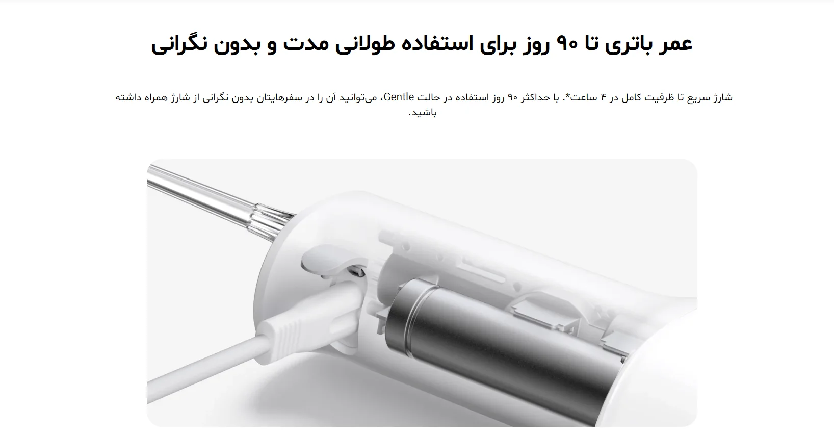 باتری داخلی این دستگاه با یک بار شارژ کامل (حدود 4 ساعت) میتواند تا 90 روز در حالت Gentle دوام بیاورد. این ویژگی، واتر فلوسر شیائومی 2 را به گزینهای عالی برای استفاده روزمره و حتی سفر تبدیل میکند.